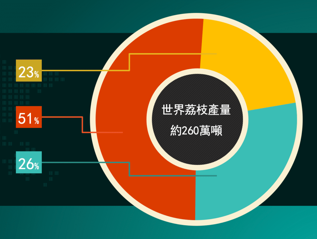 中國茂名荔枝產量約50萬噸,接近其它國家荔枝產量總和 (23%)